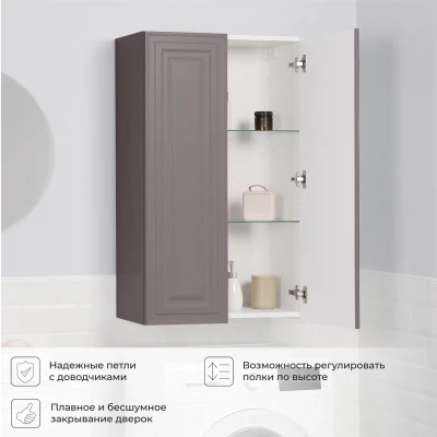Пенал в ванную из коллекции Verona 60 - это универсальное решение для современной ванной. Шкаф-пенал поможет создать комфортные условия в ванной комнате. Благодаря его компактным размерам 600х300х1000 и настенному крепежу он занимает немного места и надежно закрепляется. Пенал в ванную изготовлен из МДФ и покрыт ПВХ пленкой, что обеспечивает ему привлекательный внешний вид, а также износостойкость и долговечность. Качественная фурнитура с доводчиками и фрезерованные ручки обеспечивают легкое открывание и плавное закрывание дверок. Внутри пенала для ванной полки, где можно рационально распределить и разместить все необходимые вещи для ванной комнаты. Полки пенала легко переставить, возможно регулировать расстояние их между собой. Для точного выбора пенала в ванную комнату рекомендуем обратиться к схеме замеров, которая находится на фото в карточке товара. Размеры изделия могут отличаться +/-1 см в связи со спецификой производства. Дополнить комплект можно тумбой с раковиной и зеркалом из коллекции Verona. Изделия коллекции качественные, функциональные и органически впишутся в популярные и современные интерьерные решения для ванных комнат. Шкаф пенал для ванной комнаты доставляется в предварительно собранном виде, надежно упакован.