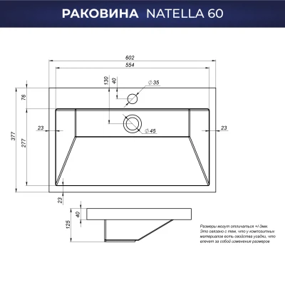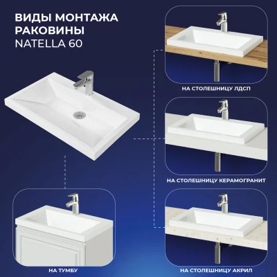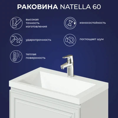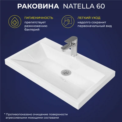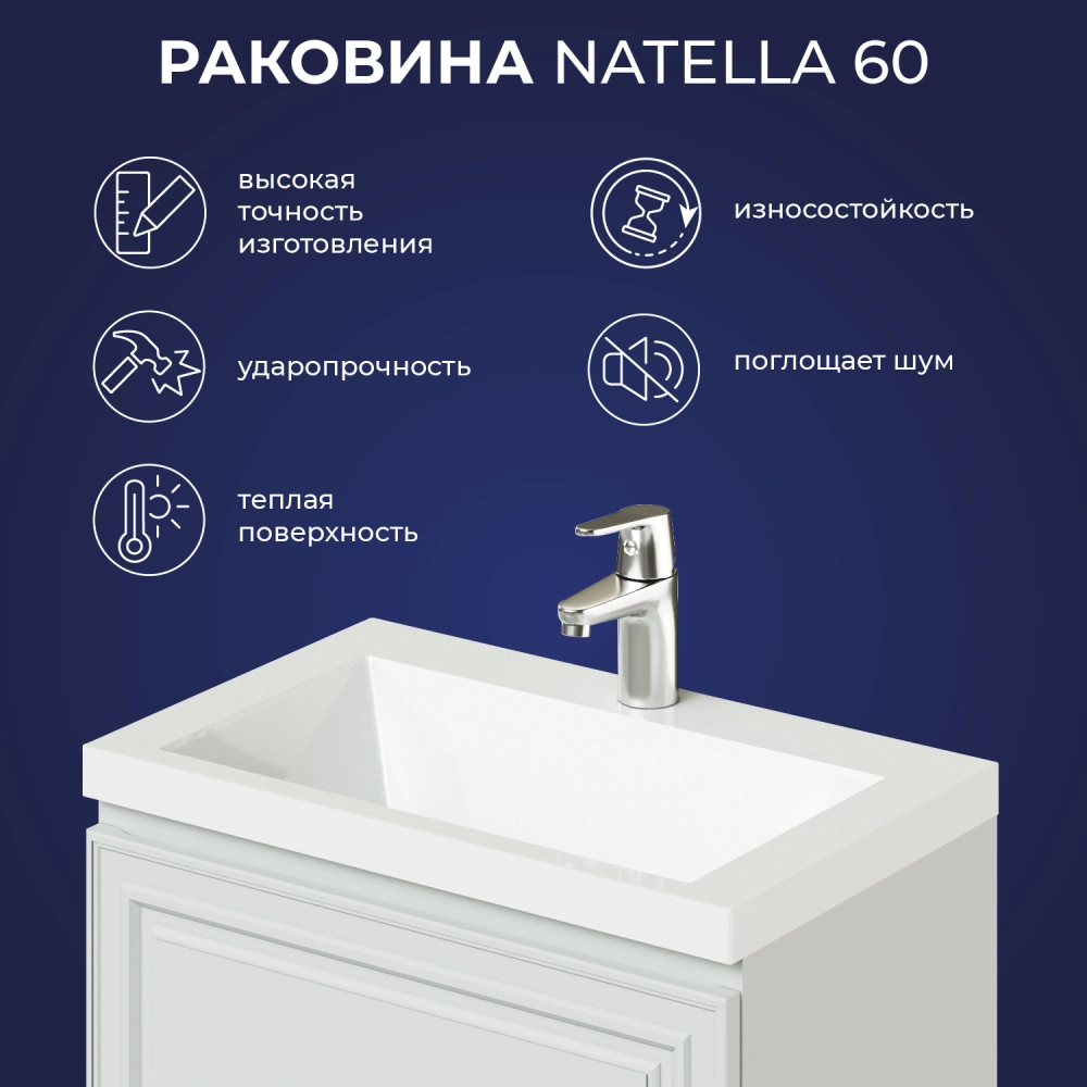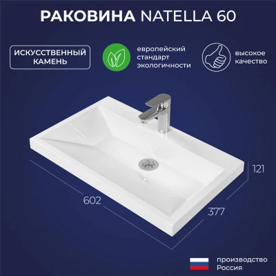 Раковина в ванную Итана Natella изготовлена из искусственного мрамора. Верхний слой Гелькоута образует декоративно защитное покрытие, которое легко мыть. Не содержит вредных для здоровья человека веществ, экологически безопасный. Шумопоглощающая поверхность. Раковина в ванную имеет одно готовое отверстие под смеситель, без перелива. Раковина может быть встроена на мебель, в столешницу и на подстолье. Раковина в ванную доставляется в надежной упаковке.