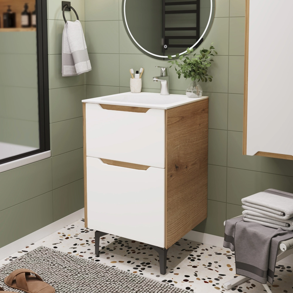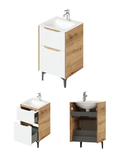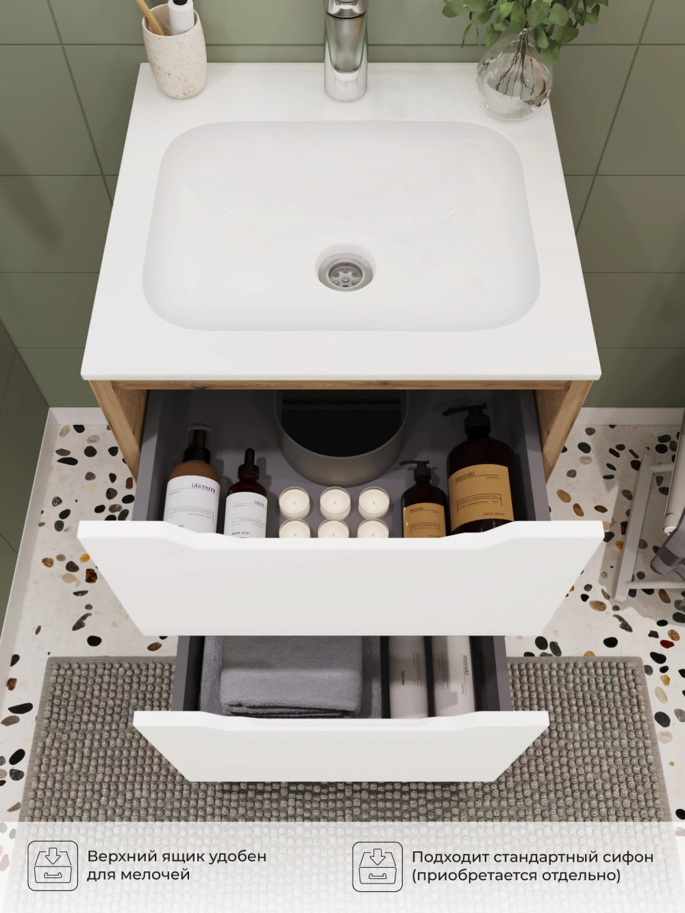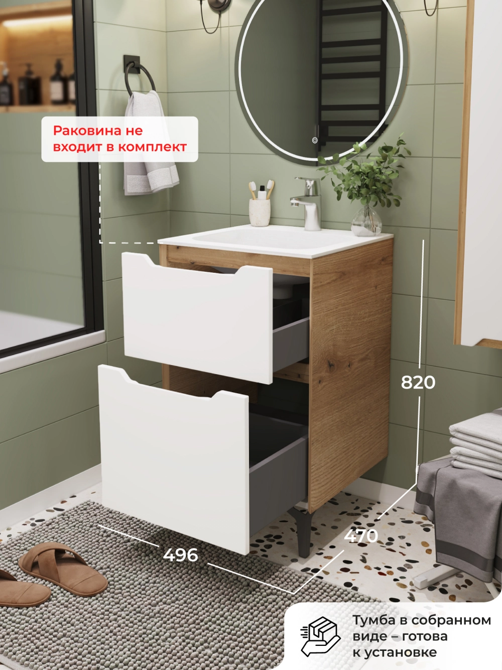 Напольная тумба под раковину в ванную комнату из коллекции Nill - это сочетание современной стилистики и богатого функционала. Размеры подвесной тумбы под раковину 496х470х820 - идеальный выбор для ванной комнаты или туалета. Ручки интегрированы в фасад ящика, что исключает возможность случайного удара о фурнитуру. Качественная фурнитура с доводчиками обеспечивает легкое открывание и плавное закрывание ящиков. Тумба под раковину с двумя ящиками, где можно рационально распределить и разместить все необходимые вещи для ванной комнаты. Вырез под сифон универсальный, для любого типа сифона. Для точного выбора тумбы под раковину в ванную комнату рекомендуем обратиться к схеме замеров, которая находится на фото в карточке товара, размеры изделия могут отличаться +/-1 см в связи со спецификой производства. Тумба под раковину для ванной доставляется в предварительно собранном виде, надежно упакована.
