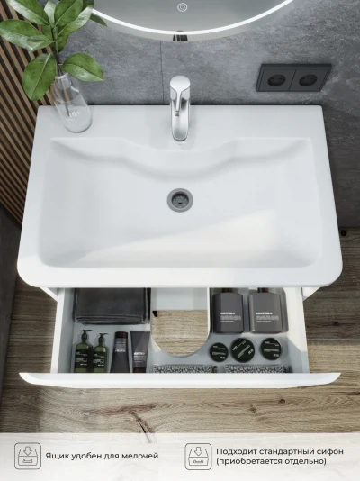 Напольная тумба под раковину в ванную из коллекции Roberto - это сочетание современной стилистики и богатого функционала. Тумба для ванны изготовлена из прочного МДФ, поэтому выдерживает высокие эксплуатационные нагрузки и обеспечивает дополнительную защиту тумбы под раковину от влаги и перепадов температуры. Качественная фурнитура с доводчиками обеспечивает легкое открывание и плавное закрывание ящиков. Вырез под сифон универсальный, для любого типа. Благодаря своей конструкции тумба обеспечивает удобный доступ к раковине и позволяет скрыть коммуникации. Тумба под раковину в ванную оснащена удобным ящиком для хранения, что позволяет разместить всё необходимое под рукой. Ручки интегрированы в фасад, что исключает возможность случайного удара о фурнитуру. Для точного выбора тумбы под раковину в ванную комнату рекомендуем обратиться к схеме замеров, которая находится на фото в карточке товара, размеры изделия могут отличаться +/-1 см в связи со спецификой производства. Тумба для ванной доставляется в предварительно собранном виде, надежно упакована.