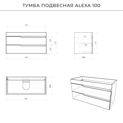 Тумба под раковину в ванную Итана из коллекции Alexa. Тумба в ванную отличается элегантным дизайном и качественным исполнением, прекрасно сочетая функциональность и эстетическую привлекательность. Размеры подвесной тумбы под раковину 998*451*520 - идеальный выбор для ванной комнаты или туалета. Подвесная конструкция тумбы под раковину позволяет сэкономить место на полу и визуально расширяет пространство. Тумба под раковину в ванную подвесная выполнена из МФД, что гарантирует долговечность эксплуатации и износостойкость. Качественная фурнитура с доводчиками обеспечивает легкое открывание и плавное закрывание ящиков. Ручки интегрированы в фасад, что исключает возможность случайного удара о фурнитуру. Тумба под раковину с ящиками, где можно рационально распределить и разместить все необходимые вещи для ванной комнаты. Для точного выбора тумбы рекомендуем обратиться к схеме замеров, которая находится на фото в карточке товара. Размеры изделия могут отличаться +/-1 см в связи со спецификой производства. Подвесная тумба под раковину приходит в надежной упаковке и в собранном виде.