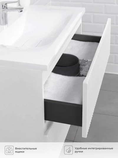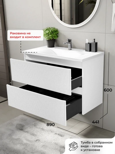 Подвесная тумба под раковину из коллекции Kate станет настоящим украшением ванной комнаты в современном стиле. Навесной способ установки тумбы в ванную дает возможность не только визуально увеличить пространство, но и обеспечивает быстрый и удобный доступ для уборки. Размеры подвесной тумбы под раковину 890*441*600 - идеальный выбор для ванной комнаты или туалета. Тумба для ванны изготовлена из МДФ и покрыта ПВХ пленкой, поэтому выдерживает высокие эксплуатационные нагрузки. Качественная фурнитура с доводчиками обеспечивает легкое открывание и плавное закрывание ящиков. Вырез под сифон универсальный, для любого типа. Благодаря своей конструкции тумба обеспечивает удобный доступ к раковине и позволяет скрыть коммуникации. Тумба под раковину в ванную оснащена двумя удобными ящиками для хранения, что позволяет разместить всё необходимое под рукой. Для точного выбора тумбы под раковину в ванную комнату рекомендуем обратиться к схеме замеров, которая находится на фото в карточке товара, размеры изделия могут отличаться +/-1 см в связи со спецификой производства. Тумба для ванной доставляется в предварительно собранном виде, надежно упакована.