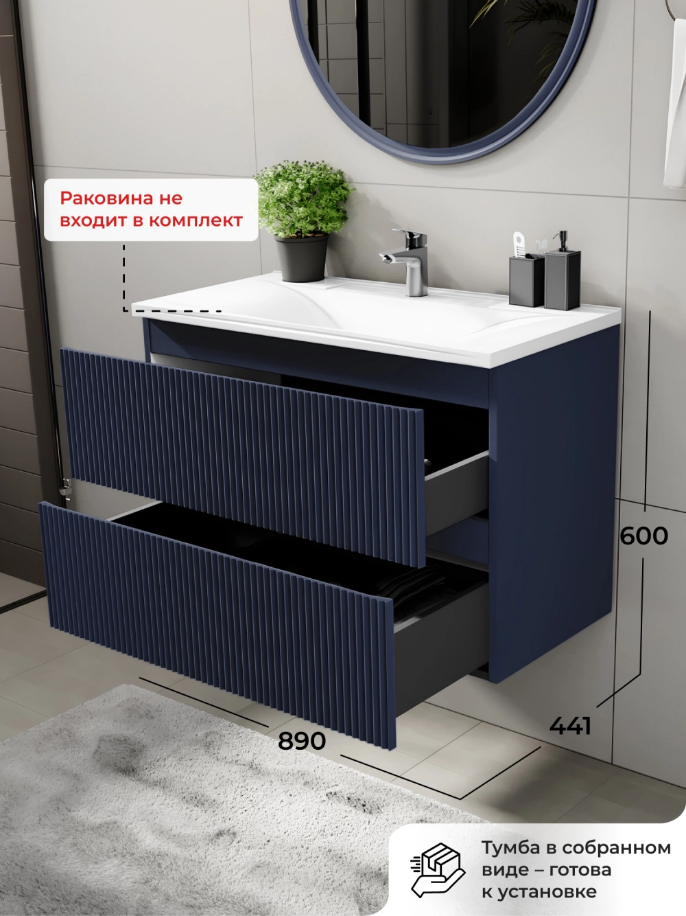 Подвесная тумба под раковину из коллекции Kate станет настоящим украшением ванной комнаты в современном стиле. Навесной способ установки тумбы в ванную дает возможность не только визуально увеличить пространство, но и обеспечивает быстрый и удобный доступ для уборки. Размеры подвесной тумбы под раковину 890*441*600 - идеальный выбор для ванной комнаты или туалета. Тумба для ванны изготовлена из МДФ и покрыта ПВХ пленкой, поэтому выдерживает высокие эксплуатационные нагрузки. Качественная фурнитура с доводчиками обеспечивает легкое открывание и плавное закрывание ящиков. Вырез под сифон универсальный, для любого типа. Благодаря своей конструкции тумба обеспечивает удобный доступ к раковине и позволяет скрыть коммуникации. Тумба под раковину в ванную оснащена двумя удобными ящиками для хранения, что позволяет разместить всё необходимое под рукой. Для точного выбора тумбы под раковину в ванную комнату рекомендуем обратиться к схеме замеров, которая находится на фото в карточке товара, размеры изделия могут отличаться +/-1 см в связи со спецификой производства. Тумба для ванной доставляется в предварительно собранном виде, надежно упакована.