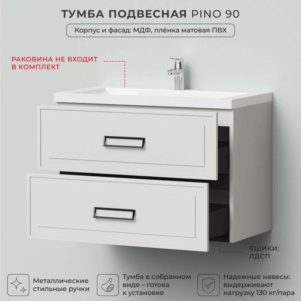 Тумба под раковину в ванную Итана из коллекции Pino. Размеры подвесной тумбы под раковину 901х480х600 - идеальный выбор для ванной комнаты или туалета. Подвесная конструкция тумбы под раковину позволяет сэкономить место на полу и визуально расширяет пространство. Тумба под раковину в ванную подвесная выполнена из МФД и покрыта пленкой ПВХ, что гарантирует долговечность эксплуатации и износостойкость. Качественная фурнитура с доводчиками обеспечивает легкое открывание и плавное закрывание ящиков. Тумба под раковину с двумя ящиками, где можно рационально распределить и разместить все необходимые вещи для ванной комнаты. Для точного выбора тумбы рекомендуем обратиться к схеме замеров, которая находится на фото в карточке товара. Размеры изделия могут отличаться +/-1 см в связи со спецификой производства. Подвесная тумба под раковину приходит в надежной упаковке и в собранном виде.