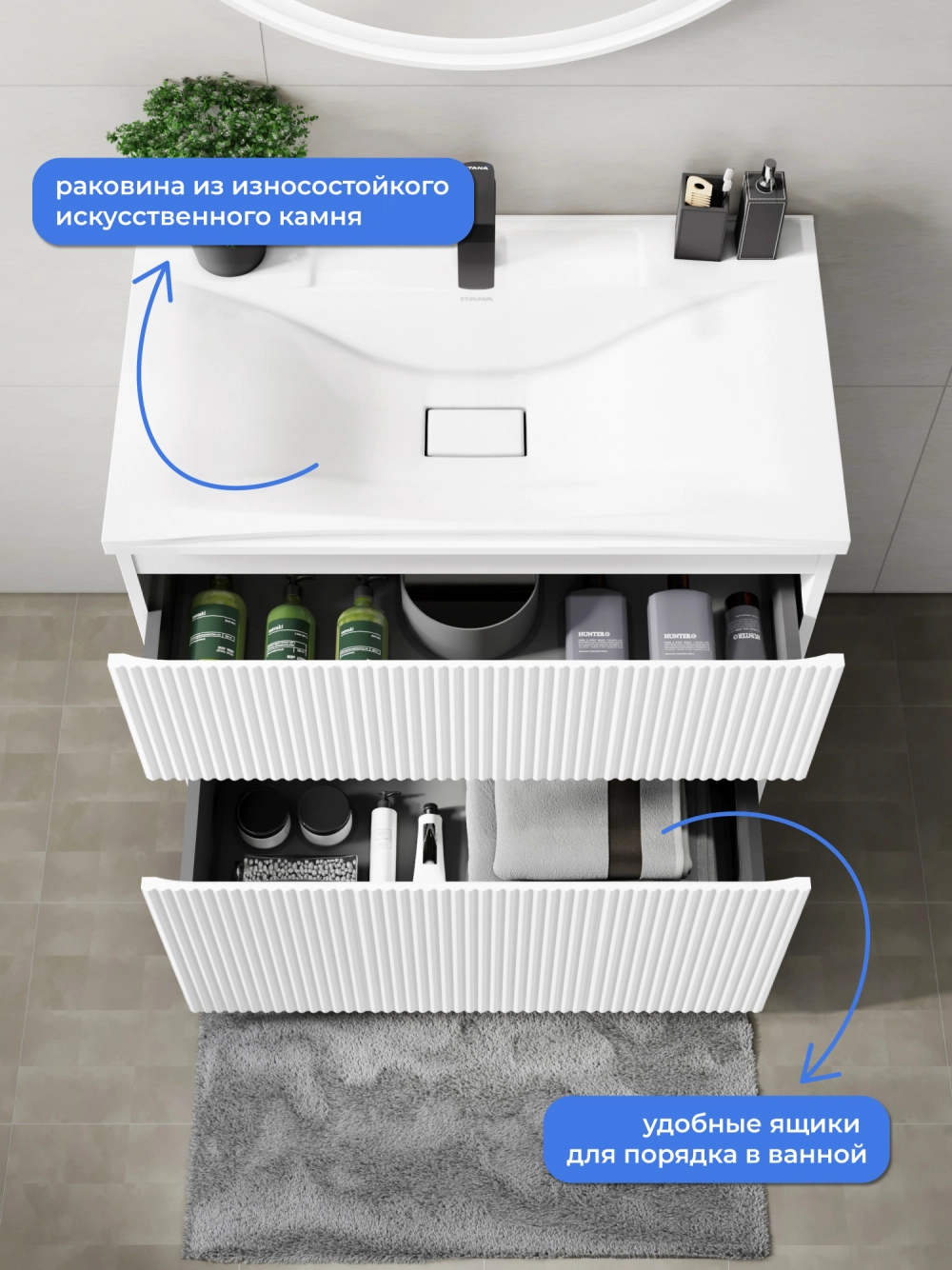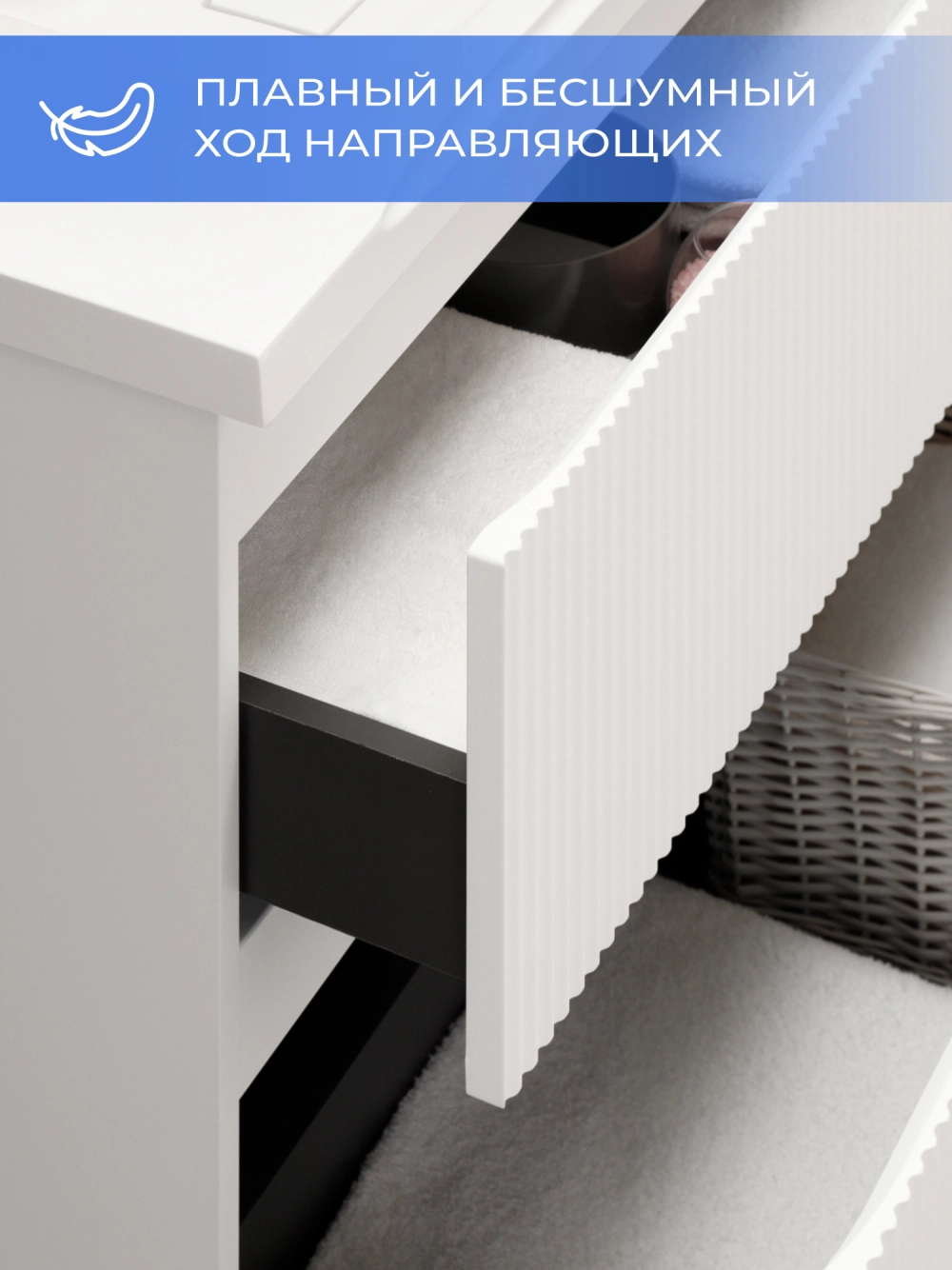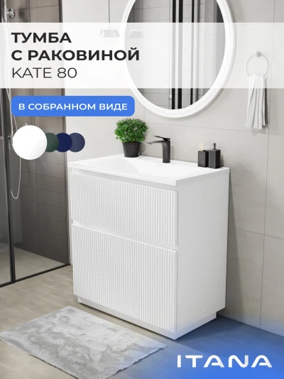 Напольная тумба с раковиной Итана Kate станет идеальным дополнением для вашей ванной комнаты, сочетая в себе стильный дизайн и функциональность. Коллекция Kate - воплотила в себе тренд на фактурные фасады. Идеальный "рубчик" - простое и стильное дизайнерское решение для декорирования фасадов - эта мебель бесспорно станет украшением современной ванной комнаты. Тумба изготовлена из высококачественных материалов, гарантируя долговечность и надежность эксплуатации. Удобные фрезерованные ручки, качественная фурнитура с доводчиками, вместительность - мы продумали все, чтобы тумба была не просто красивой, но еще и функциональной, приятной в использовании. Ее конструкция позволяет легко поддерживать порядок в ванной, ведь все мелочи будут аккуратно убраны. Раковина выполнена из искусственного камня, обладает устойчивостью к механическим повреждениям и влиянию химических средств. Стильный декор тумбы с раковиной добавляет изюминку в общий дизайн, вписываясь в современные и классические интерьеры. Удобные выдвижные ящики обеспечивают простоту доступа к содержимому тумбы. Безупречное сочетание раковины с тумбой подчеркивает общий стиль вашей ванной комнаты, делая ее уютной и функциональной.