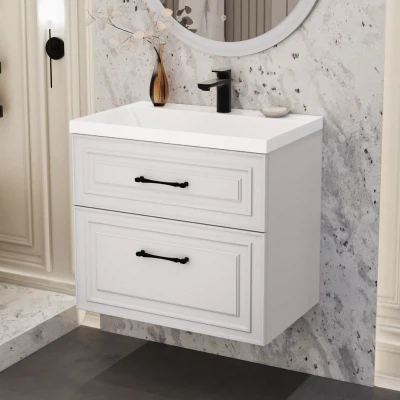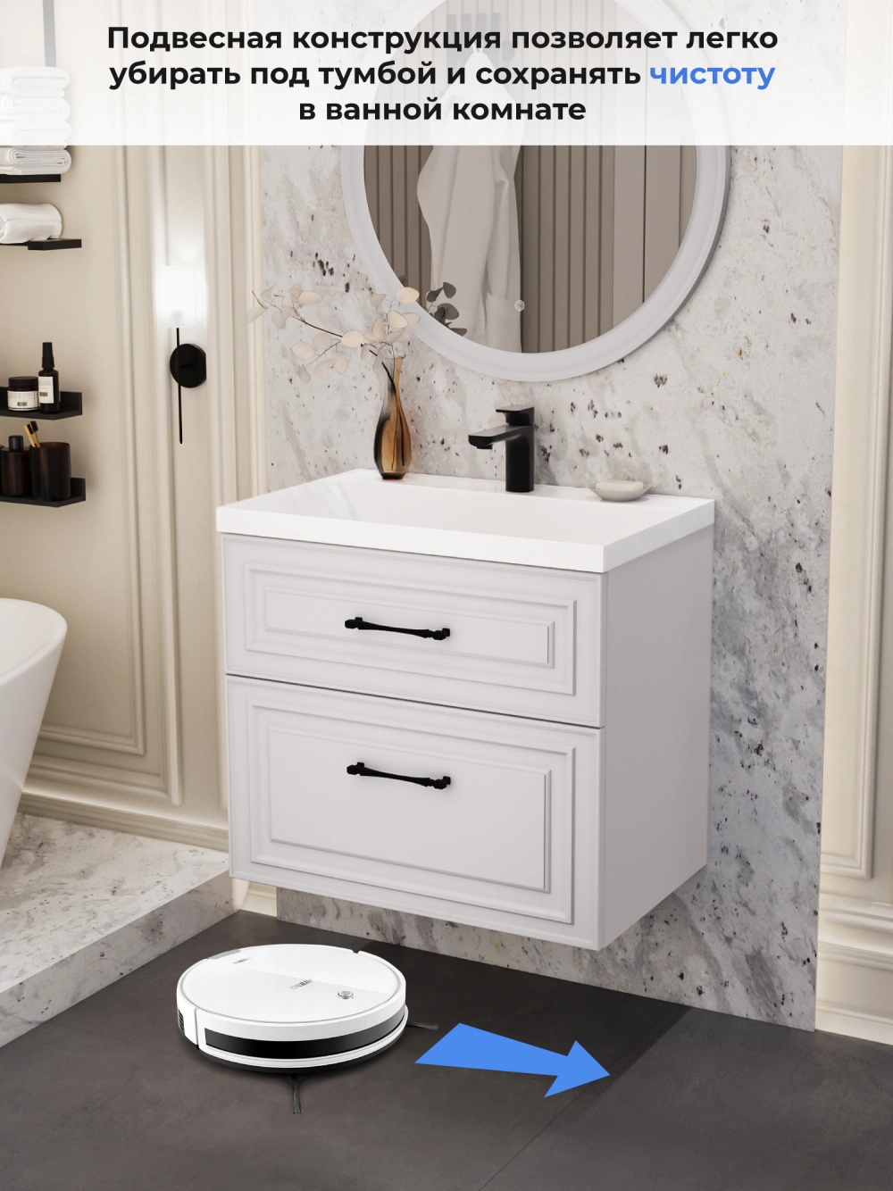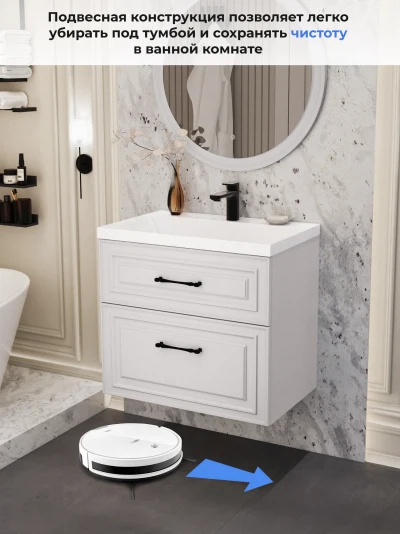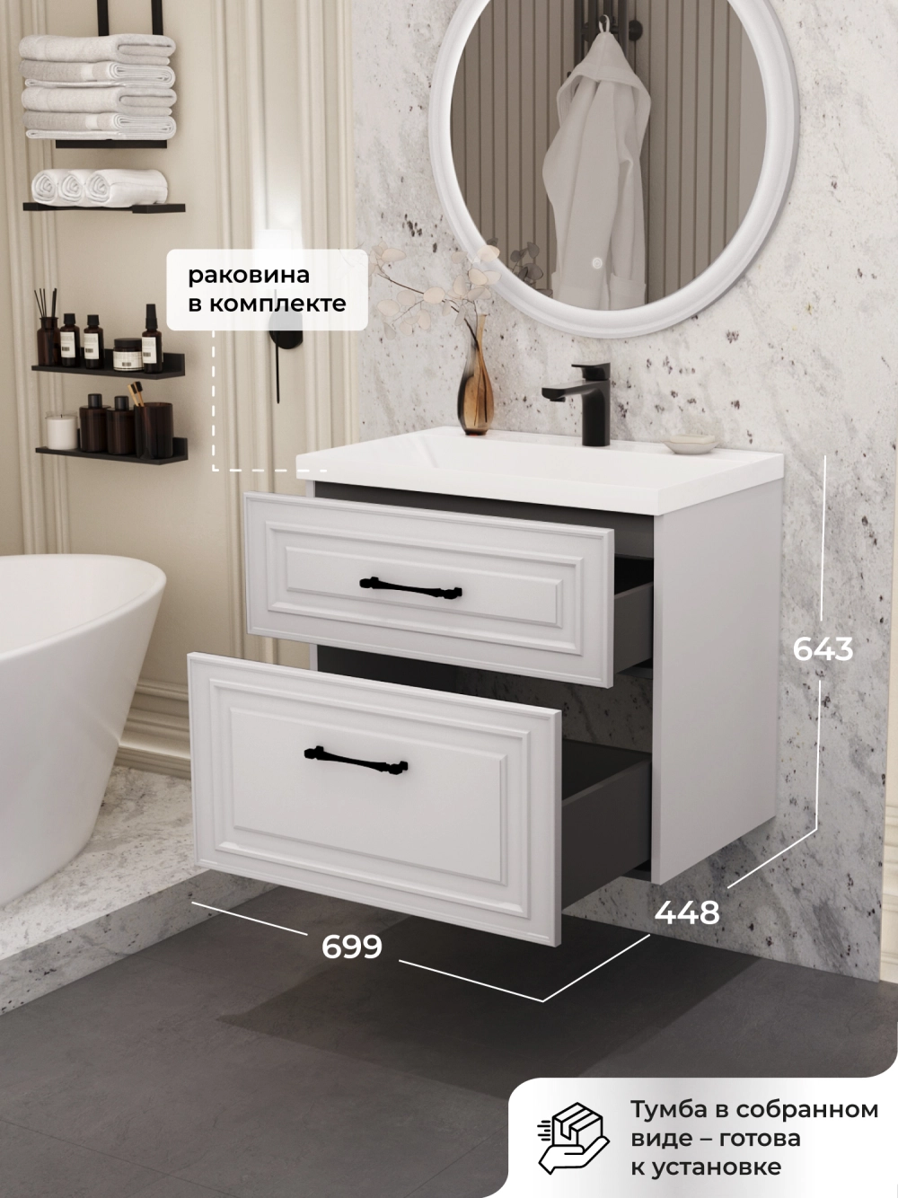 Подвесная тумба с раковиной из коллекции Verona станет настоящим украшением ванной комнаты в современном скандинавском стиле. Навесной способ установки тумбы в ванную дает возможность не только визуально увеличить пространство, но и обеспечивает быстрый и удобный доступ для уборки. Размеры подвесной тумбы с раковиной 699х448х643 - идеальный выбор для ванной комнаты или туалета. Тумба для ванны изготовлена из прочного МДФ, поэтому выдерживает высокие эксплуатационные нагрузки. Корпус и фасады тумбы для ванной покрыты матовой пленкой, что обеспечивает дополнительную защиту тумбы с раковиной от влаги и перепадов температуры. Качественная фурнитура с доводчиками обеспечивает легкое открывание и плавное закрывание ящика. Вырез под сифон универсальный, для любого типа. Благодаря своей конструкции тумба в ванную обеспечивает удобный доступ к раковине и позволяет скрыть коммуникации. Тумба с раковиной в ванную оснащена удобным ящиком для хранения, что позволяет разместить всё необходимое под рукой. Ручки интегрированы в фасад дверки шкафчика, что исключает возможность случайного удара о фурнитуру. Для точного выбора подвесной тумбы с раковиной в ванную комнату рекомендуем обратиться к схеме замеров, которая находится на третьем фото в карточке товара, размеры изделия могут отличаться +/-1 см в связи со спецификой производства. Тумба для ванной доставляется в предварительно собранном виде, надежно упакована.