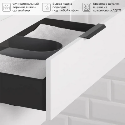 Подвесная тумба с раковиной из коллекции Alta станет настоящим украшением ванной комнаты в современном стиле. Навесной способ установки тумбы в ванную дает возможность не только визуально увеличить пространство, но и обеспечивает быстрый и удобный доступ для уборки. Размеры подвесной тумбы с раковиной 800*451*569 - идеальный выбор для ванной комнаты или туалета.Тумба с раковиной изготовлена из ламинированного ДСП, поэтому выдерживает высокие эксплуатационные нагрузки. Качественная фурнитура с доводчиками обеспечивает легкое открывание и плавное закрывание ящиков. Вырез под сифон универсальный, для любого типа. Благодаря своей конструкции тумба обеспечивает удобный доступ к раковине и позволяет скрыть коммуникации. Тумба с раковиной в ванную оснащена двумя удобными ящиками для хранения, что позволяет разместить всё необходимое под рукой. Раковина из искусственного камня– это безупречная гладкость поверхности, на которой не задерживаются загрязнения. Для точного выбора подвесной тумбы с раковиной в ванную комнату рекомендуем обратиться к схеме замеров, которая находится на фото в карточке товара, размеры изделия могут отличаться +/-1 см в связи со спецификой производства. Тумба для ванной доставляется в предварительно собранном виде, надежно упакована.