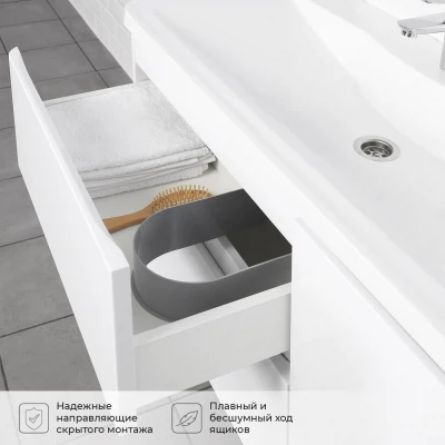 Подвесная тумба с раковиной в ванную из коллекции Roberto - это сочетание современной стилистики и богатого функционала. Тумба для ванны изготовлена из прочного МДФ, поэтому выдерживает высокие эксплуатационные нагрузк и обеспечивает дополнительную защиту тумбы с раковиной от влаги и перепадов температуры. Качественная фурнитура с доводчиками обеспечивает легкое открывание и плавное закрывание ящиков. Вырез под сифон универсальный, для любого типа. Благодаря своей конструкции тумба обеспечивает удобный доступ к раковине и позволяет скрыть коммуникации. Тумба с раковиной в ванную оснащена удобным ящиком для хранения, что позволяет разместить всё необходимое под рукой. Ручки интегрированы в фасад, что исключает возможность случайного удара о фурнитуру. Для точного выбора тумбы с раковиной в ванную комнату рекомендуем обратиться к схеме замеров, которая находится на фото в карточке товара, размеры изделия могут отличаться +/-1 см в связи со спецификой производства. Тумба для ванной доставляется в предварительно собранном виде, надежно упакована.