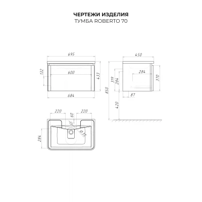 Тумба с раковиной подвесная Итана Roberto 70 с выдвижным ящиком Графит