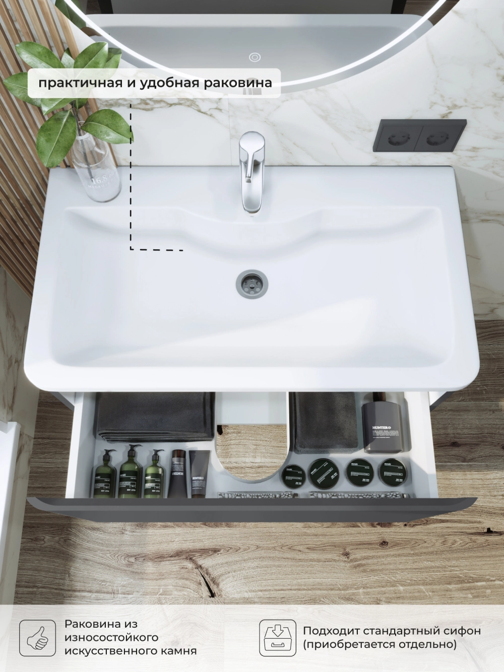 Подвесная тумба с раковиной в ванную из коллекции Roberto - это сочетание современной стилистики и богатого функционала. Тумба для ванны изготовлена из прочного МДФ, поэтому выдерживает высокие эксплуатационные нагрузк и обеспечивает дополнительную защиту тумбы с раковиной от влаги и перепадов температуры. Качественная фурнитура с доводчиками обеспечивает легкое открывание и плавное закрывание ящиков. Вырез под сифон универсальный, для любого типа. Благодаря своей конструкции тумба обеспечивает удобный доступ к раковине и позволяет скрыть коммуникации. Тумба с раковиной в ванную оснащена удобным ящиком для хранения, что позволяет разместить всё необходимое под рукой. Ручки интегрированы в фасад, что исключает возможность случайного удара о фурнитуру. Для точного выбора тумбы с раковиной в ванную комнату рекомендуем обратиться к схеме замеров, которая находится на фото в карточке товара, размеры изделия могут отличаться +/-1 см в связи со спецификой производства. Тумба для ванной доставляется в предварительно собранном виде, надежно упакована.