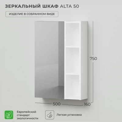 Зеркало-шкаф в ванную Alta 50 поможет создать комфортные условия в ванной комнате. Зеркало в ванную с размерами 500х160х750 мм. позволяют разместить шкаф в любом пространстве, делая его идеальным решением как для больших, так и небольших ванных комнат. Корпус и фасад изготовлены из ламинированного ДСП. Этот шкаф для ванной оснащен зеркалом, что делает его не только практичным, но и удобным для повседневного использования. Вместительные полки внутри и снаружи шкафа позволят хранить все необходимые аксессуары и косметические средства в порядке. Удобная система крепления позволяет быстро и надежно установить шкаф на стену. Для точного выбора шкафа с зеркалом в ванную комнату рекомендуем обратиться к схеме замеров, которая находится на фото в карточке товара, размеры изделия могут отличаться +/-1 см в связи со спецификой производства. Зеркальный шкаф в ванную доставляется в предварительно собранном виде, надежно упакован.