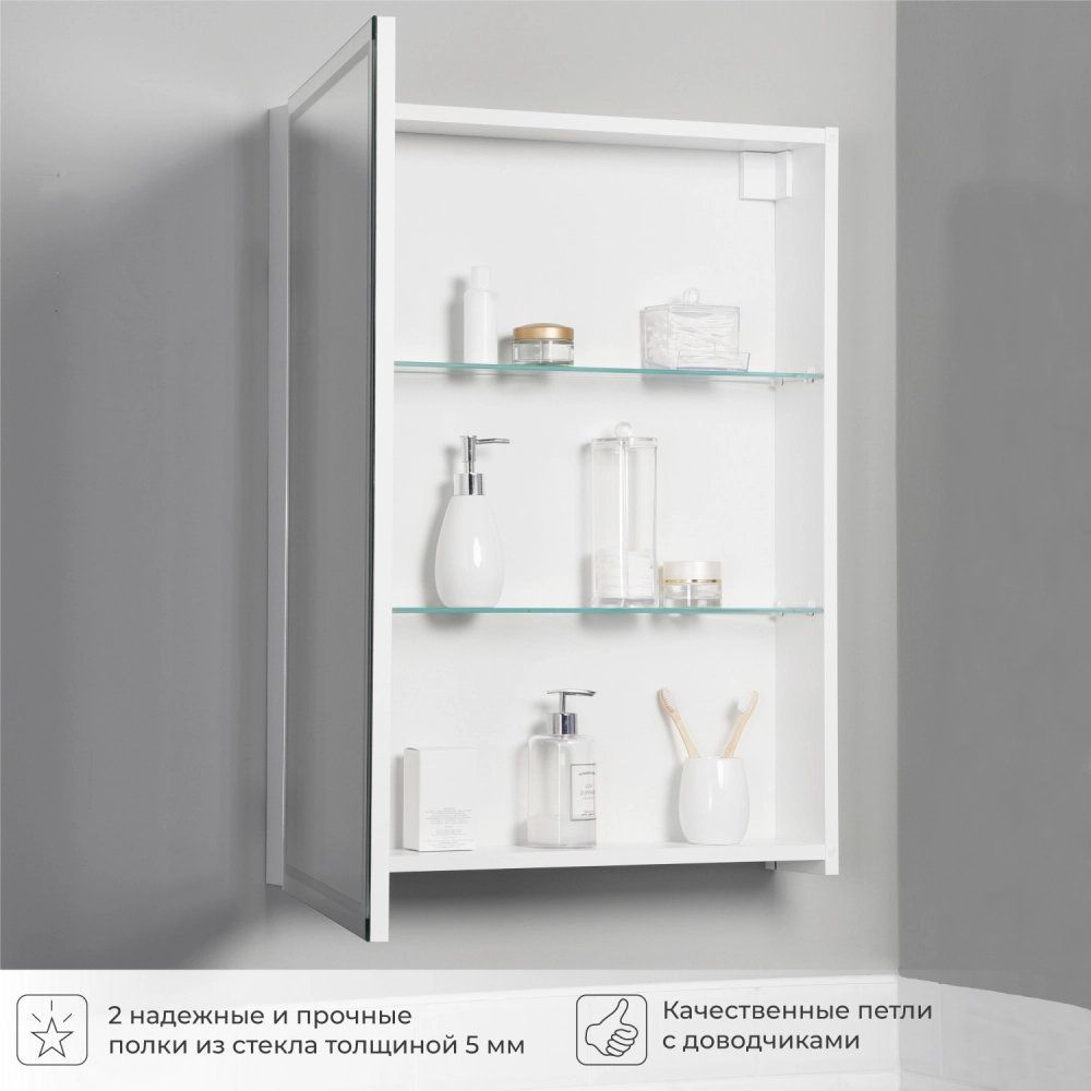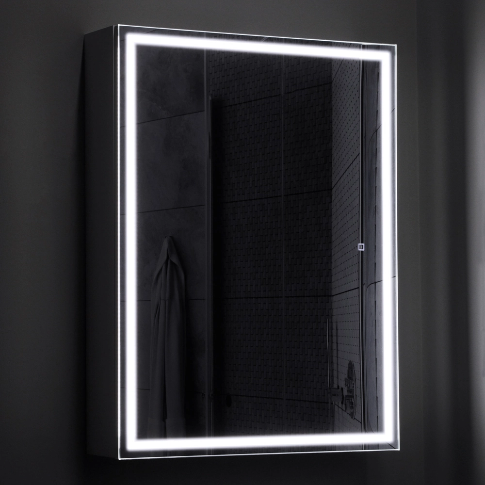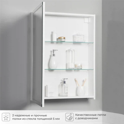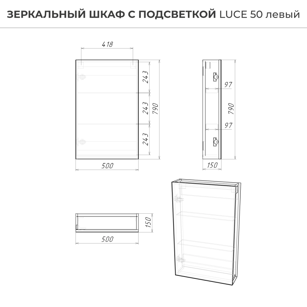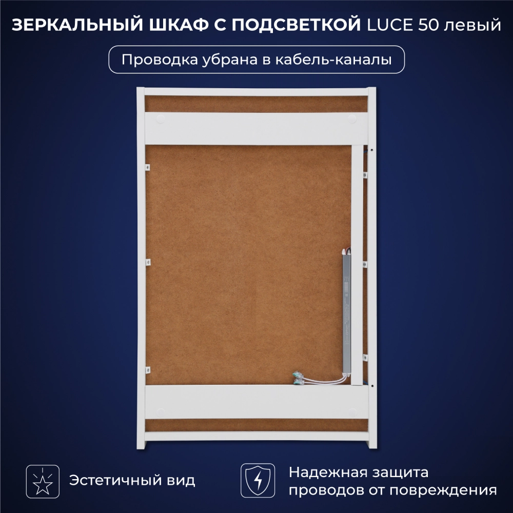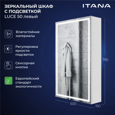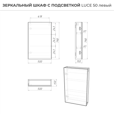 Зеркало-шкаф в ванную с подсветкой Luce 50 - это идеальное решение для вашей ванной комнаты. Этот элегантное и функциональное зеркало в ванную с размерами 500х150х790 мм. легко впишется в интерьер любой ванной комнаты, делая её визуально более просторной и светлой. Зеркало оборудовано современной энергосберегающей подсветкой, которая обеспечивает яркий и равномерный свет, делая ваши утренние процедуры комфортными и удобными. Мягкое освещение идеально подходит для нанесения макияжа, бритья и других гигиенических процедур. Основное преимущество этого зеркального шкафа с подсветкой в ванную - это его продуманная конструкция. Левостороннее открывание обеспечивает удобный доступ ко всем необходимым вещам, а вместительные полки внутри шкафа позволят хранить все необходимые аксессуары и косметические средства в порядке. Зеркальный шкаф Итана Luce 50 изготовлен из высококачественных материалов. Удобная система крепления позволяет быстро и надежно установить шкаф на стену. Для точного выбора шкафа с зеркалоом в ванную комнату рекомендуем обратиться к схеме замеров, которая находится на фото в карточке товара, размеры изделия могут отличаться +/-1 см в связи со спецификой производства. Зеркальный шкаф с подсветкой доставляется в предварительно собранном виде, надежно упакован.