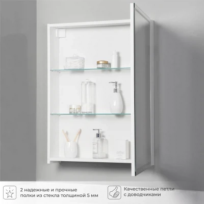 Зеркало-шкаф в ванную с подсветкой Luce 50 - это идеальное решение для вашей ванной комнаты. Этот элегантное и функциональное зеркало в ванную с размерами 500х150х790 мм. легко впишется в интерьер любой ванной комнаты, делая её визуально более просторной и светлой. Зеркало оборудовано современной энергосберегающей подсветкой, которая обеспечивает яркий и равномерный свет, делая ваши утренние процедуры комфортными и удобными. Мягкое освещение идеально подходит для нанесения макияжа, бритья и других гигиенических процедур. Основное преимущество этого зеркального шкафа с подсветкой в ванную - это его продуманная конструкция. Правосторонее открывание обеспечивает удобный доступ ко всем необходимым вещам, а вместительные полки внутри шкафа позволят хранить все необходимые аксессуары и косметические средства в порядке. Зеркальный шкаф Итана Luce 50 изготовлен из высококачественных материалов. Удобная система крепления позволяет быстро и надежно установить шкаф на стену. Для точного выбора шкафа с зеркалоом в ванную комнату рекомендуем обратиться к схеме замеров, которая находится на фото в карточке товара, размеры изделия могут отличаться +/-1 см в связи со спецификой производства. Зеркальный шкаф с подсветкой доставляется в предварительно собранном виде, надежно упакован.