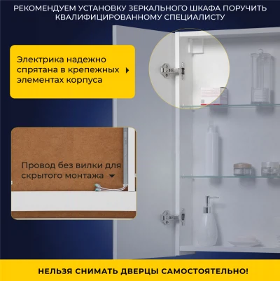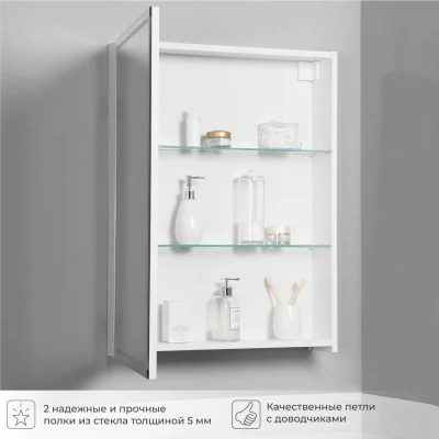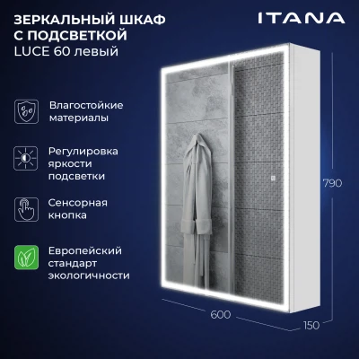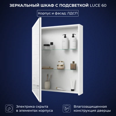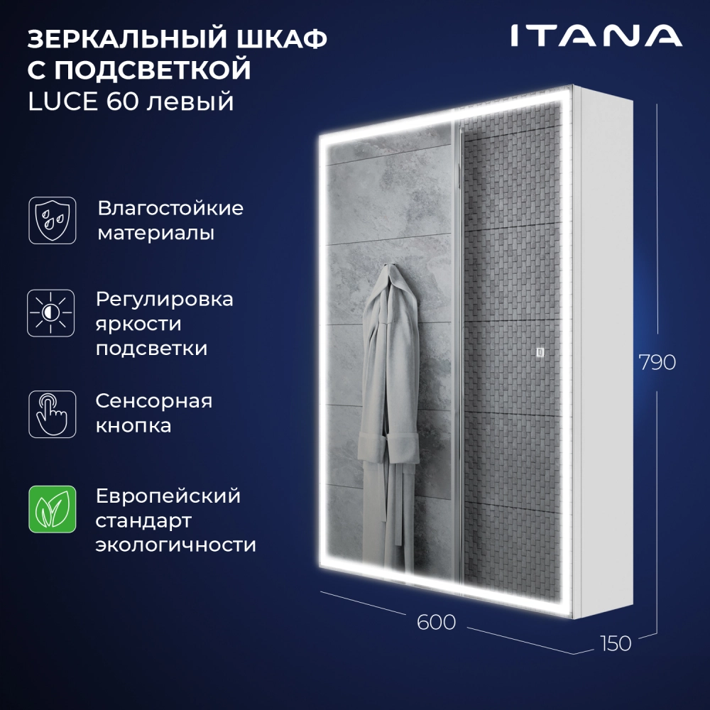 Зеркало-шкаф в ванную с подсветкой Luce 60 - это идеальное решение для вашей ванной комнаты. Этот элегантное и функциональное зеркало в ванную с размерами 600х150х790 мм. легко впишется в интерьер любой ванной комнаты, делая её визуально более просторной и светлой. Зеркало оборудовано современной энергосберегающей подсветкой, которая обеспечивает яркий и равномерный свет, делая ваши утренние процедуры комфортными и удобными. Мягкое освещение идеально подходит для нанесения макияжа, бритья и других гигиенических процедур. Основное преимущество этого зеркального шкафа с подсветкой в ванную - это его продуманная конструкция. Левосторонее открывание обеспечивает удобный доступ ко всем необходимым вещам, а вместительные полки внутри шкафа позволят хранить все необходимые аксессуары и косметические средства в порядке. Зеркальный шкаф Итана Luce 60 изготовлен из высококачественных материалов. Удобная система крепления позволяет быстро и надежно установить шкаф на стену. Для точного выбора шкафа с зеркалоом в ванную комнату рекомендуем обратиться к схеме замеров, которая находится на фото в карточке товара, размеры изделия могут отличаться +/-1 см в связи со спецификой производства. Зеркальный шкаф с подсветкой доставляется в предварительно собранном виде, надежно упакован.