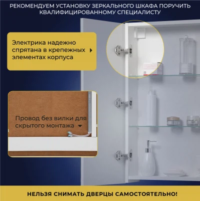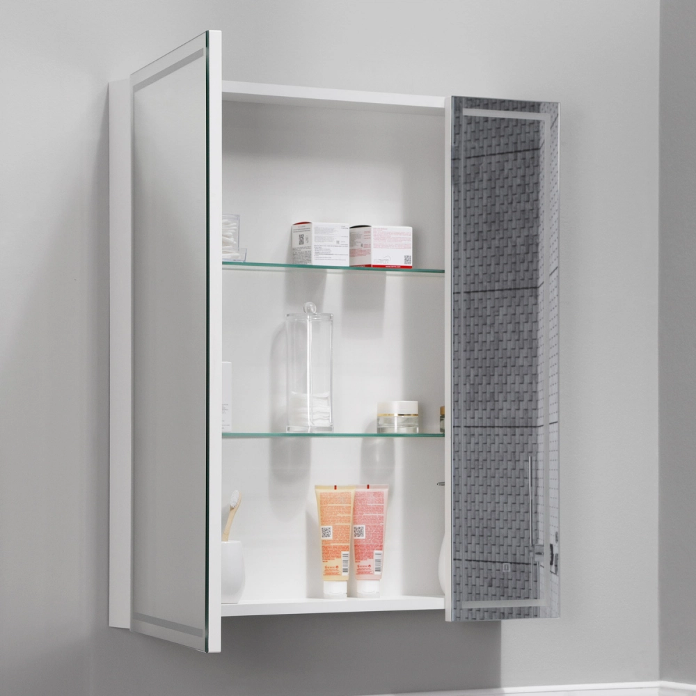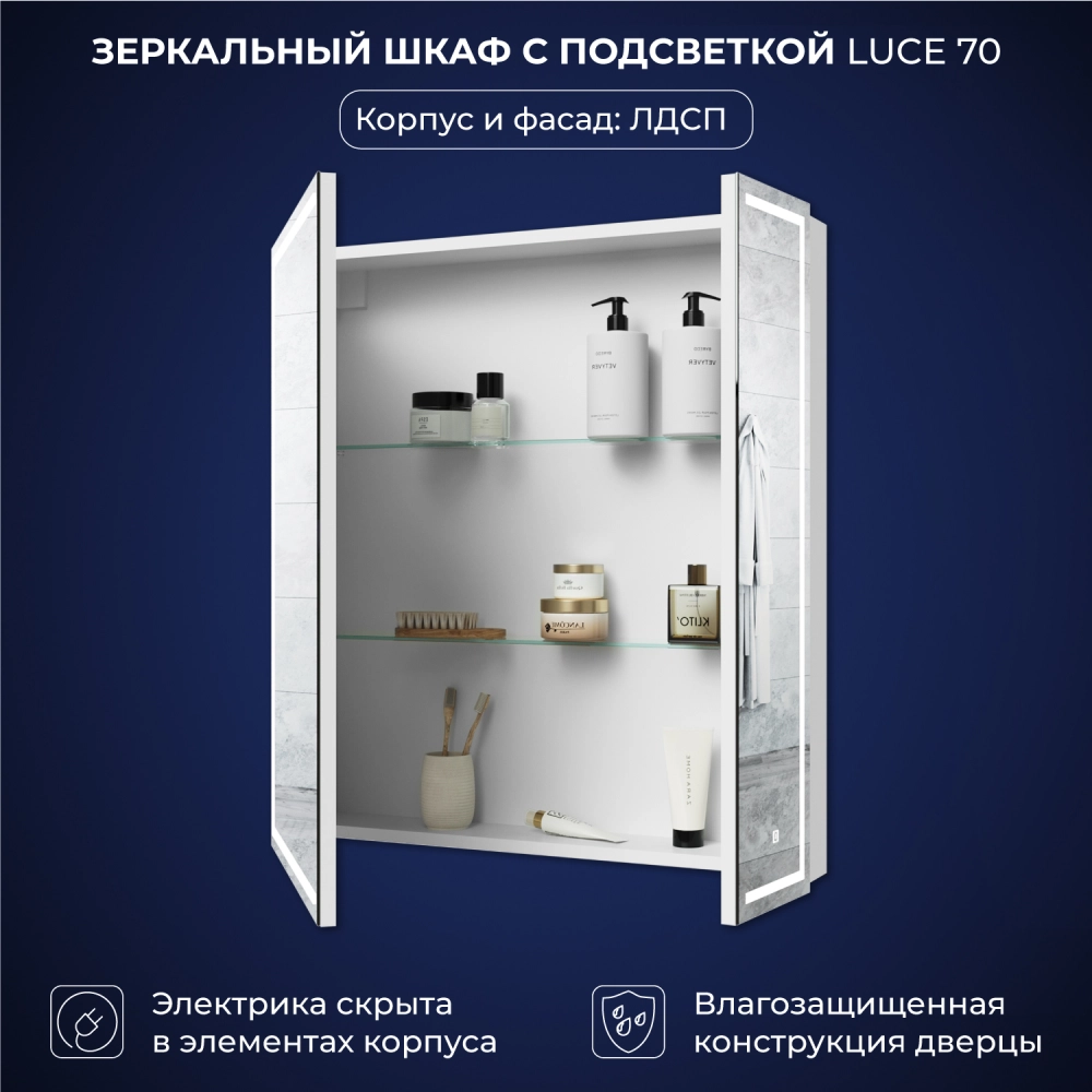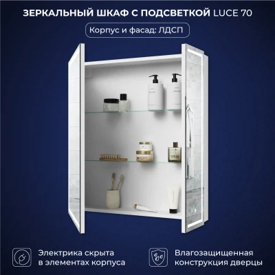 Зеркало-шкаф в ванную с подсветкой Luce 70 - это идеальное решение для вашей ванной комнаты. Этот элегантное и функциональное зеркало в ванную с размерами 700х150х790 мм. легко впишется в интерьер любой ванной комнаты, делая её визуально более просторной и светлой. Зеркало оборудовано современной энергосберегающей подсветкой, которая обеспечивает яркий и равномерный свет, делая ваши утренние процедуры комфортными и удобными. Мягкое освещение идеально подходит для нанесения макияжа, бритья и других гигиенических процедур. Основное преимущество этого зеркального шкафа с подсветкой в ванную - это его продуманная конструкция. Вместительные полки внутри шкафа позволят хранить все необходимые аксессуары и косметические средства в порядке. Зеркальный шкаф Итана Luce 70 изготовлен из высококачественных материалов. Удобная система крепления позволяет быстро и надежно установить шкаф на стену. Для точного выбора шкафа с зеркалоом в ванную комнату рекомендуем обратиться к схеме замеров, которая находится на фото в карточке товара, размеры изделия могут отличаться +/-1 см в связи со спецификой производства. Зеркальный шкаф с подсветкой доставляется в предварительно собранном виде, надежно упакован.