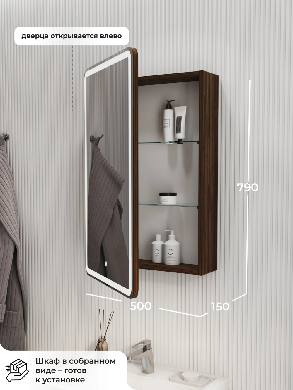 Зеркало-шкаф в ванную с подсветкой Miro 50 - это идеальное решение для вашей ванной комнаты. Этот элегантное и функциональное зеркало в ваннуюс размерами 500х150х790 мм. Зеркало оборудовано современной энергосберегающей подсветкой, которая обеспечивает яркий и равномерный свет, делая ваши утренние процедуры комфортными и удобными. Мягкое освещение идеально подходит для нанесения макияжа, бритья и других гигиенических процедур. Основное преимущество этого зеркального шкафа с подсветкой в ванную - это его продуманная конструкция. Левостороннее открывание обеспечивает удобный доступ ко всем необходимым вещам, а вместительные полки внутри шкафа позволят хранить все необходимые аксессуары и косметические средства в порядке. Зеркальный шкаф Итана Miro 50 изготовлен из высококачественных материалов. Удобная система крепления позволяет быстро и надежно установить шкаф на стену. Для точного выбора шкафа с зеркалом в ванную комнату рекомендуем обратиться к схеме замеров, которая находится на фото в карточке товара, размеры изделия могут отличаться +/-1 см в связи со спецификой производства. Зеркальный шкаф с подсветкой доставляется в предварительно собранном виде, надежно упакован.