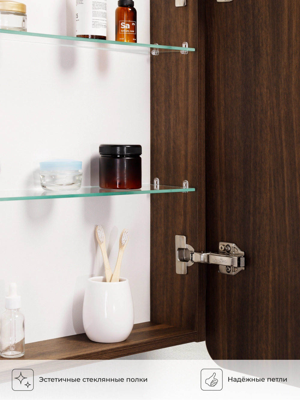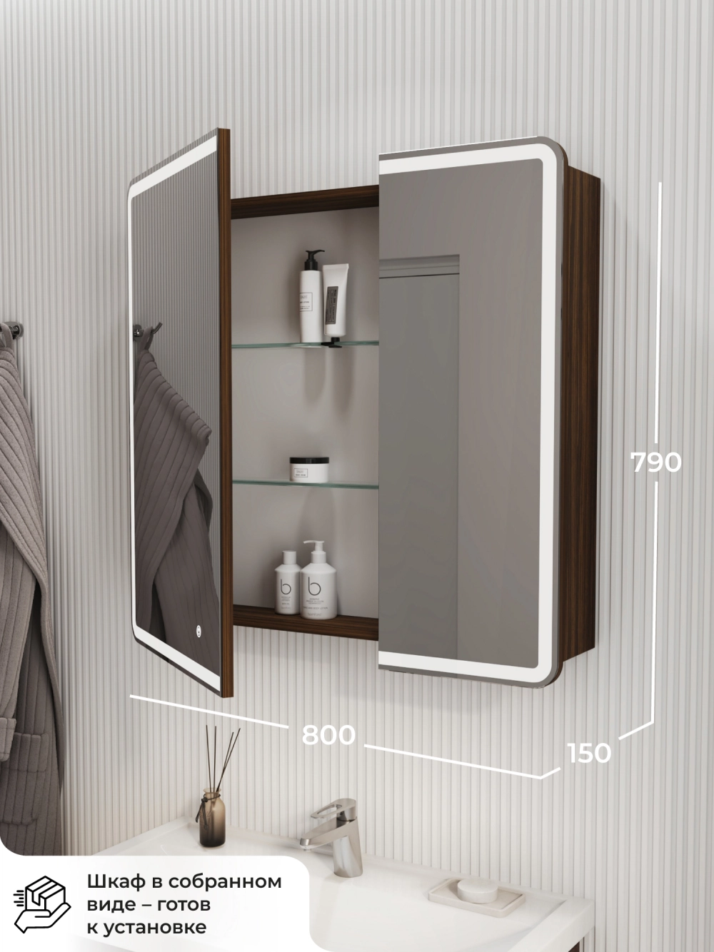 Зеркало-шкаф в ванную с подсветкой Miro 80 - это идеальное решение для вашей ванной комнаты. Этот элегантное и функциональное зеркало в ваннуюс размерами 800х150х790 мм. Зеркало оборудовано современной энергосберегающей подсветкой, которая обеспечивает яркий и равномерный свет, делая ваши утренние процедуры комфортными и удобными. Мягкое освещение идеально подходит для нанесения макияжа, бритья и других гигиенических процедур. Основное преимущество этого зеркального шкафа с подсветкой в ванную - это его продуманная конструкция. Вместительные полки внутри шкафа позволят хранить все необходимые аксессуары и косметические средства в порядке. Зеркальный шкаф Итана Miro 80 изготовлен из высококачественных материалов. Удобная система крепления позволяет быстро и надежно установить шкаф на стену. Для точного выбора шкафа с зеркалом в ванную комнату рекомендуем обратиться к схеме замеров, которая находится на фото в карточке товара, размеры изделия могут отличаться +/-1 см в связи со спецификой производства. Зеркальный шкаф с подсветкой доставляется в предварительно собранном виде, надежно упакован.