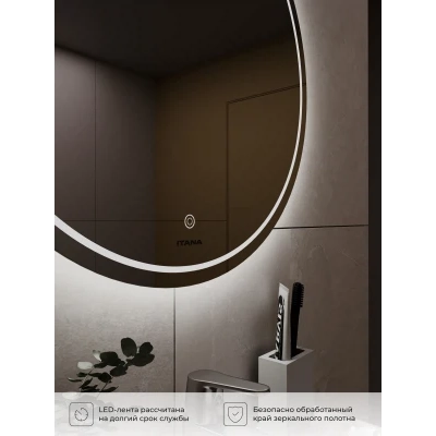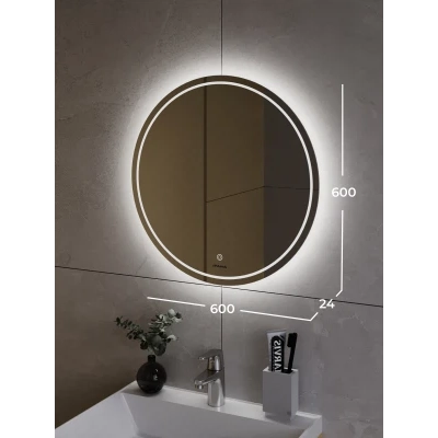 Зеркало с подсветкой в ванную Итана Line D-600, круглое зеркало из коллекции Line изготовлено из зеркального полотна толщиной 4 мм. Это современная и лаконичная по дизайну модель с удобным сенсорным управлением подсветки. При изготовлении используется светодиодная лента с плотностью диодов 120 шт./м и мощностью 9,6 Вт/м, цветовая температура 6000К (холодный свет) создающая мягкое и равномерное свечение по периметру зеркала. Зеркало для ванной с подсветкой рассчитано на 25 000 часов работы в непрерывном режиме. Все электрические компоненты размещены внутри корпуса из полистирола. Зеркало с подсветкой настенное может использоваться в помещениях с повышенной влажностью воздуха. В комплекте предусмотрен настенный крепеж. Изделие прошло сертификацию. Гарантия - 2 года.